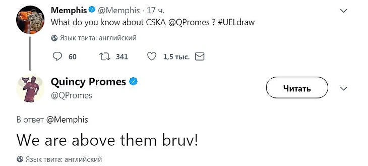 О серьёзности их намерений говорит и тот факт, что сразу после результатов жеребьевки, полузащитник «Лиона» Мемфис Депай в своём твиттере обратился к форварду московского «Спартака» и своему партнеру по сборной Нидерландов Квинси Промесу с вопросом, что тот знает о «ЦСКА». Футболист «Спартака» ответил, что красно-белые выше «ЦСКА».