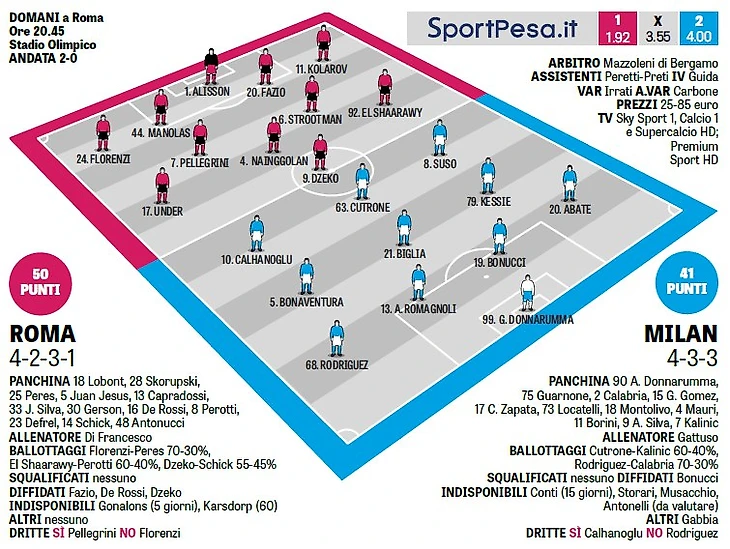 Несмотря на то, что в очных противостояниях «Милан» победил в Риме за тринадцать лет лишь единожды, сейчас "россонери" под предводительством "комманданте" Гаттузо представляют реальную угрозу. Дженнаро удалось воскресить команду после провальной первой части сезона. Невооруженным глазом заметны изменения в оборонительном аспекте. "Дьяволы" не проигрывают вот уже одиннадцать матчей, пропустили в них всего четыре мяча, а семь поединков сыграли "на ноль". И заслуга в этом не только в надежности пары difensore centrale Алессио Романьоли и Леонардо Бонуччи, но и в существенном прогрессе остальных игроков, в особенности средней линии. Все винтики машины Гаттузо в схеме 4-3-3 работают как единый механизм, за исключением, пожалуй, центральных нападающих, тех которые prima punta. Пришедшие за приличные деньги в межсезонье Никола Калинич и Андре Сильва возложенных надежд, мягко говоря, не оправдывают. Хорват большую часть сезона провел в лазарете, а португалец откровенно разочаровывает. Гаттузо удалось реанимировать многих игроков "россонери", однако Андре Сильва до сих пор не может раскрыться. Tuttosport сообщает, что мистер окончательно потерял веру в него, и агенты attacante начали поиск новой команды для своего клиента. Лучше прочих в авангарде атаки «Милана» выглядит 20-летний воспитанник Патрик Кутроне, а большинство голов "красно-черных" забивают "вингеры" и атакующие полузащитники (Сусо, Чалханоглу, Бонавентура, Борини). Но даже в таких условиях «Милан» с Дженнаро Гаттузо набирает в среднем за матч на полбалла больше, чем с Винченцо Монтеллой в начале сезона.