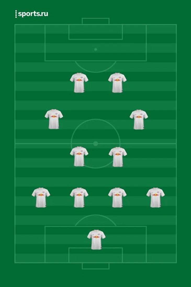 Это наиболее мощное оружие команды Хазенхюттля. Во многом благодаря полной слаженности в прессинге и контрпрессинге "Лейпцигу" удалось достичь таких высот в прошлом сезоне. Однако структура немного изменилось в новом году, так как команда пробилась в ЛЧ, и нужно было слегка изменить модель, чтобы сделать прессинг чуть менее энергозатратным. Выглядит это следующим образом: