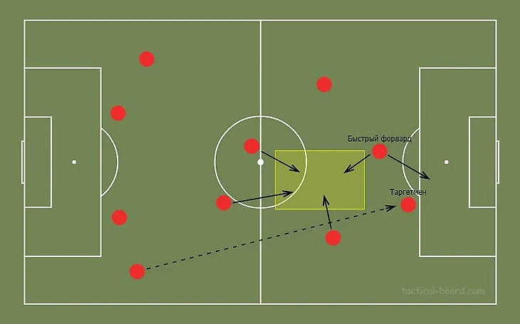 Переход в атаку, как я уже отметил, осуществляется длинными передачами на таргетмена под забегание к нему за спину быстрого форварда. Поскольку вероятность того, что данный пас дойдет, невысока, то для быстрого возврата мяча себе используется контрпрессинг. Обратите внимание, как много игроков сразу готовы включиться в борьбу за мяч в зоне подбора. Следовательно, команда Хазенхюттеля не зависит от того, насколько активно её прессингуют в стадии начала атаки. Главное - доставить мяч до таргетмена, а там либо через выигранную верховую борьбу, либо через контрпрессинг будет закреплено владение.