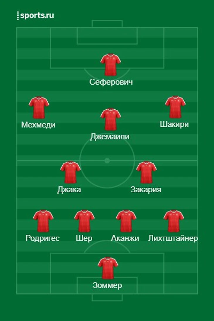 Зоммер – Лихтштайнер, Аканжи, Шер (Джуру), Родригес – Джака, Закария (Бехрами) – Шакири, Джемаили, Мехмеди (Цубер) – Сеферович
