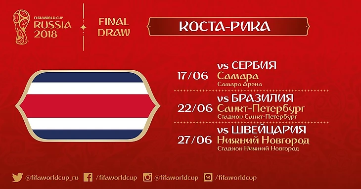 Календарь же для команды Оскара Рамиреса кажется не идеальным, но весьма приемлемым: в матче первого тура им играть с сербами, крепким соперником, которому могут помешать проблемы внутри федерации. После встречи с пентакампеонами предстоит игра против Швейцарии, имеющая высокие шансы быть решающей. Интересно, что в этой встрече сойдутся сборные двух нейтральных государств, и ничья почти наверняка не устроит ни одну из них. В этом поединке команда из страны сыра, банков и часов наверняка завладеет позиционным преимуществом, что будет только на руку «тикос», любящим и умеющим играть на контратаках. Сверхатакующие крайние защитники альпийской сборной дадут много пространства подвижной группе атаки центральноамериканцам.