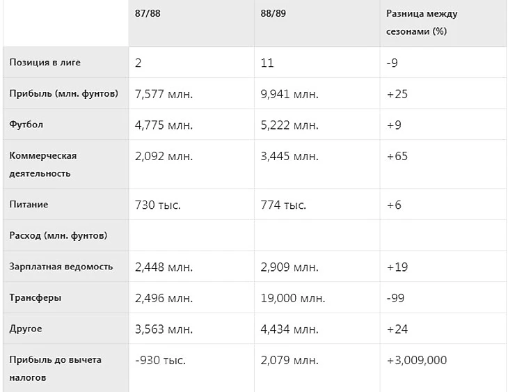 Чтобы понять, какая обстановка пребывала в «Юнайтед», нужно посмотреть на финансовые отчёты первых двух полноценных лет руководства командой Фергюсоном. Таблица 3 представляет ключевые финансовые показатели «Манчестер Юнайтед» за сезоны 1987/88 и 1988/89. Доход повышался, особенно здоровый рост наблюдается за счёт коммерческой деятельности, такой как конференции, проведённые во владениях клуба. Но можно обратить внимание, что основная разница между первыми двумя годами – это существенное понижение расходов на трансферы. Наблюдается падение от 2,5 миллионов фунтов до 19 тысяч фунтов. В совокупности с повышением доходов, это привело к 3 миллионам фунтам прибыли. Итого, за год клуб пришёл от 930 тысяч фунтов убытков к чистой прибыли 2079000 фунтов.