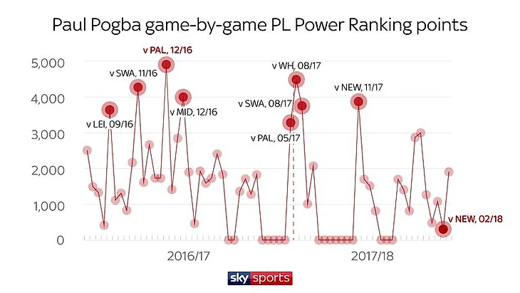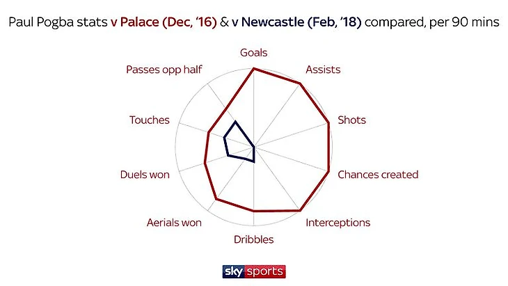 Лучшим матчем Погба (согласно методологии Sky Sports Power Rankings) с момента возвращения в «Юнайтед» был победный поединок против «Кристал Пэлас» (2-1) в декабре 2016 года.