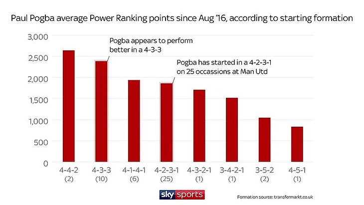 По данным transfermarkt.co.uk, Моуриньо чаще всего использовал 4-2-3-1 в «Юнайтед», а Погба играл в этом составе 25 раз в АПЛ.