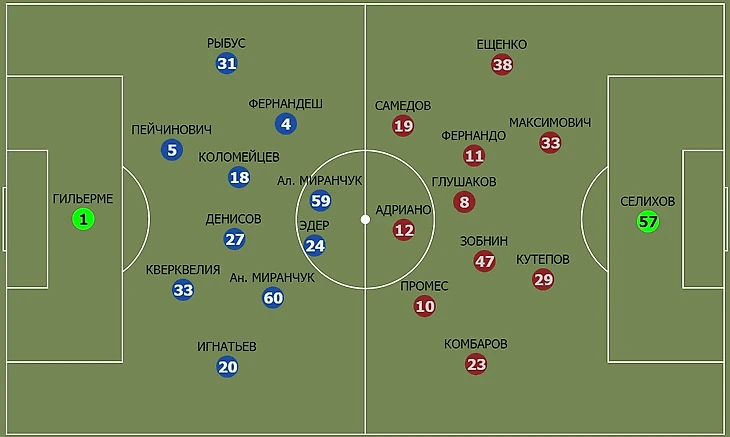 С точки зрения позиционного расположения и воспрепятствования чужим атакам Эдер и Алексей Миранчук, пожалуй, провели идеальный матч. Статистически они не сделали ничего сверхъестественно, но по большей части игры успевали располагаться именно в ключевых участках, где потенциально могла проходить проникающая передача «Спартака» с доставкой мяча между линиями через центр или полуфланг.