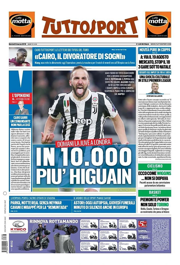 Завтра «Юве» в Лондоне. Максимальный выезд болельщиков Бьянконери на ответный матч Лиги Чемпионов против «Тоттенхэма». Пипита больше не чувствует боли, Аллегри делает ставку на него, чтобы завоевать выход в четвертьфинал. После европейской схватки начнётся план по обгону «Наполи».