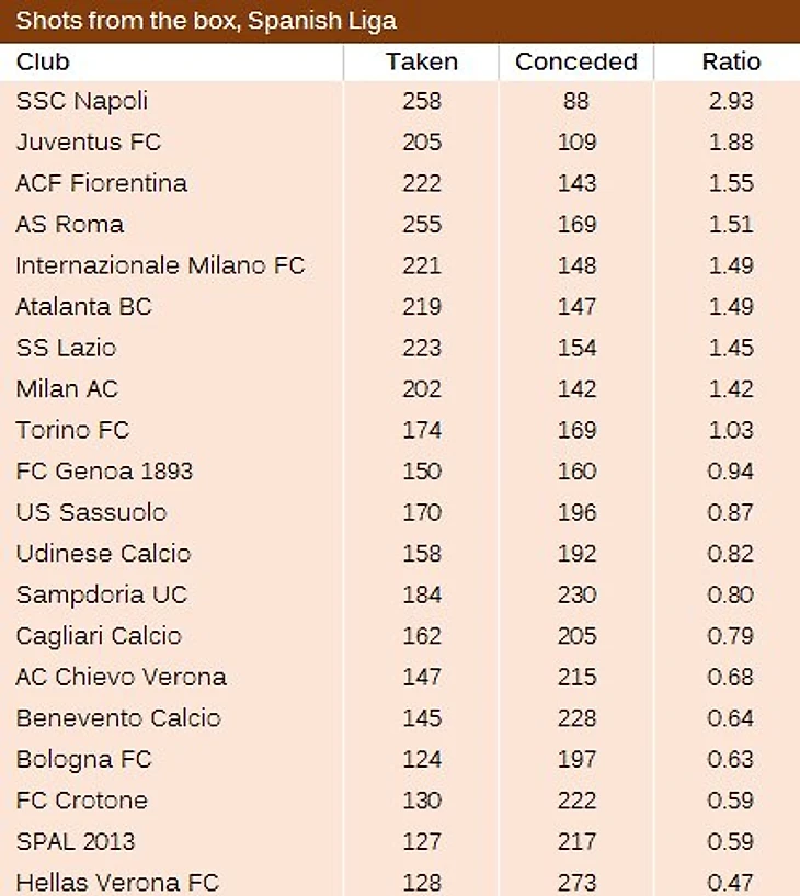 Таблица показывает количество ударов из штрафной, совершенные клубом (shots taken) и количество допущеных из своей штрафной ударов (shots conceded). Ratio - разница.