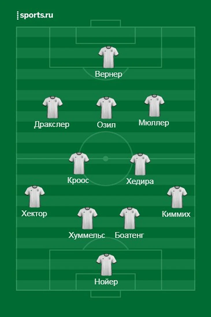 Нойер (тер Стеген) – Киммих, Боатенг, Хуммельс, Хектор (Платтенхардт) – Хедира, Кроос – Мюллер, Озил, Дракслер (Сане) – Вернер (Вагнер)