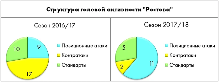 С контратаками все еще хуже – лишь 14 моментов и 2 гола («Амкару» и «Спартаку»), хотя в прошлом сезоне в этом компоненте «Ростов» был безоговорочно лучшим в лиге (40 моментов/17 голов в 30 турах). Как следствие, структура голевой активности «горожан» изменилась кардинальным образом.