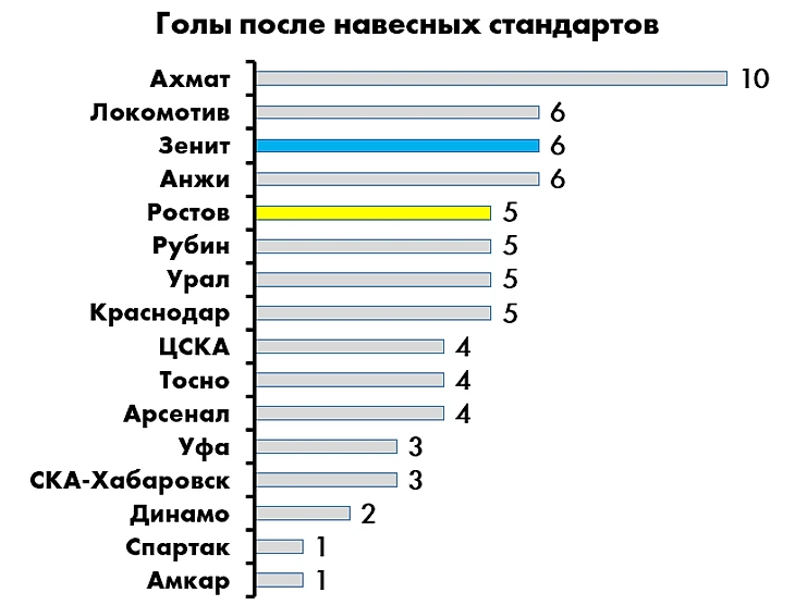 Во многом благодаря неувядающему Калачеву навесные стандарты дончан стабильно опасны (5 забитых мячей из 18), а вот достойного исполнителя стандартов ударных после ухода Нобоа в «Зенит» так и не нашлось.
