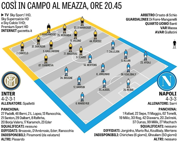 "Наш соперник подходит к игре взбешенным после неудачного матча. Но у нас неудач было больше, поэтому наша ярость должна превосходить ярость неаполитанцев" - говорит главный тренер «Интера» Лучано Спаллетти на предматчевой пресс-конференции. В последнее время со спортивной агрессией у миланцев проблемы. Команда создает неприлично мало моментов у чужих ворот, вследствие чего мало забивает. Добавить цинизма в завершающей стадии атак поможет полностью залечивший травму бедра капитан и лучший бомбардир миланцев Мауро Икарди. Успешно прошел курс восстановления от похожего повреждения основой центральный диффенсоре Миранда. Сегодня алленаторе миланцев может рассчитывать на оптимальный состав.