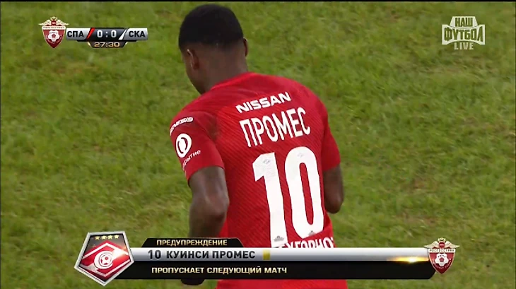 Карпов сначала бедром пересекает траекторию движения ноги Промеса, а потом слегка подбивает ногу. Никакой симуляции, как и у Самедова в игре с "Локомотивом", но Левников умеет считать до 4-х.