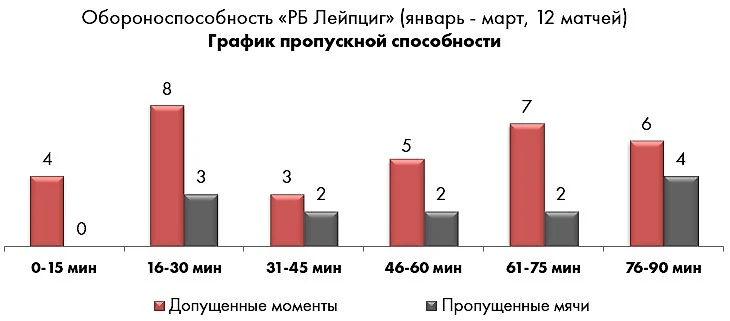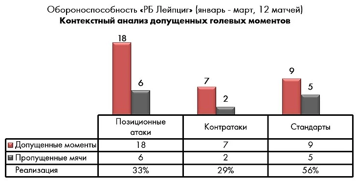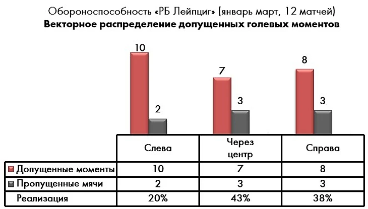 В 12 матчах этого календарного года «РБ Лейпциг» пропустил 8 мячей после игровых комбинаций, и в 5 случаях – когда сопернику удавалось ускользнуть из этой ловушки.