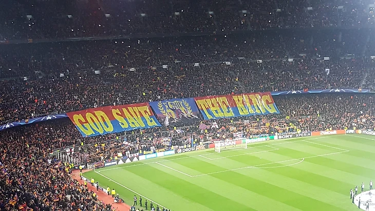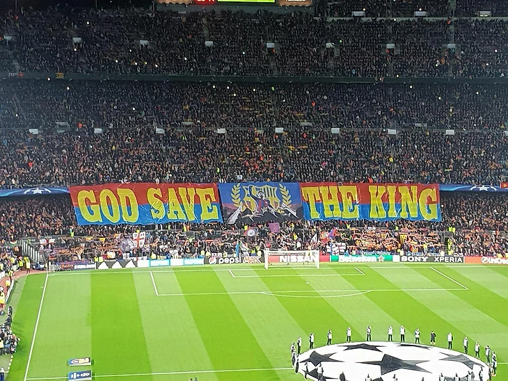 Фанаты «Барселоны» устроили шикарный перформанс в ответном матче Лиги чемпионов с «Челси», растянув на одной из трибун «Камп Ноу» баннер в честь Лео Месси с надписью «Боже, храни короля».