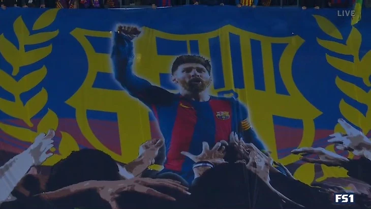 На баннере также оказался фрагмент легендарной фотографии, сделанной после камбэка «Барселоны» в матче с «ПСЖ». Лео поблагодарил фанатов голом уже на второй минуте.