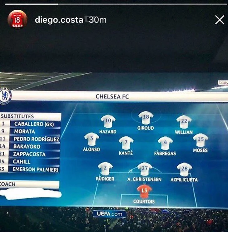 Еще недавно игравший в Лондоне Диего Коста поддержал «Челси» перед матчем с «Барселоной» и опубликовал в сториз состав англичан на игру. Один нюанс - испанец замазал имя главного тренера Антонио Конте.