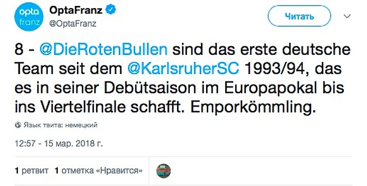 «РБ Лейпциг» - первая после «Карлсруэ» сезона 1993/1994 немецкая команда, прошедшая в четвертьфинал еврокубка в свой дебютный сезон. Из грязи в князи!