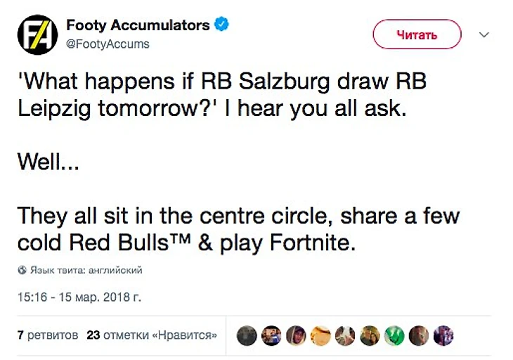 Вы все спрашиваете, что будет, если «РБ Зальцбургу» завтра выпадет «Ред Булл Лейпциг». Что ж... Они все сядут в кружочек, выпьют несколько баночек «Ред Булла» и начнут гонять в «Fortnite».