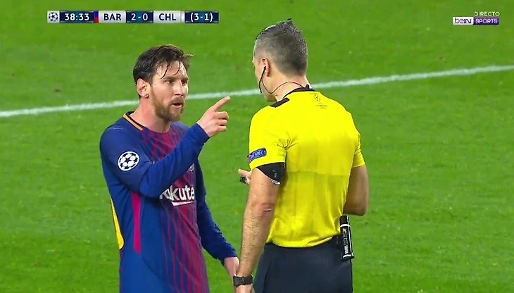 Вспоминая Барселона - Челси. Месси подбирает нужные слова для арбитра встречи.