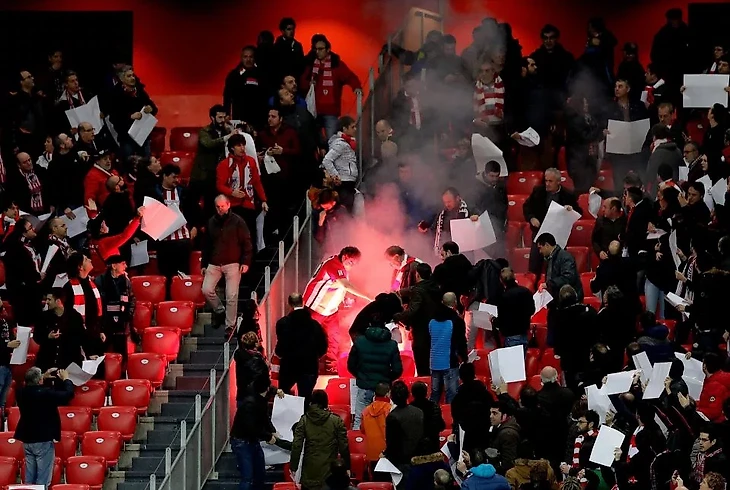 Зажигали фанаты обеих команд. Есть пострадавшие. Ножом в шею ранен охранник стадиона. Другой охранник получил телесные повреждения.