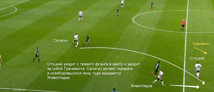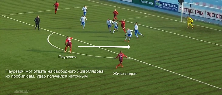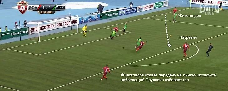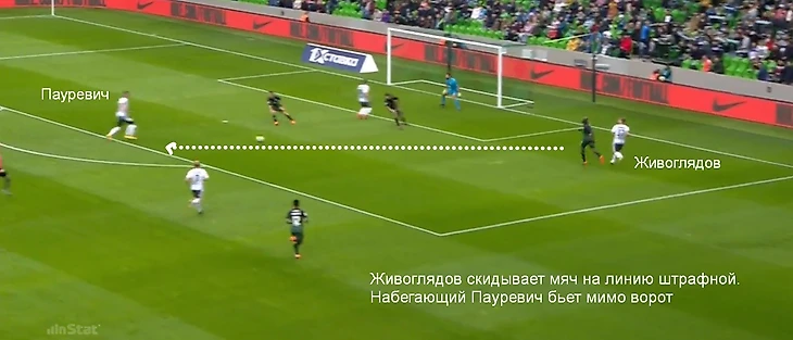 Проходы Живоглядова очень опасны: Дмитрий может как навесить во вратарскую, так и откатить мяч к линии штрафной. В обоих случаях пас может получить Иван Пауревич.