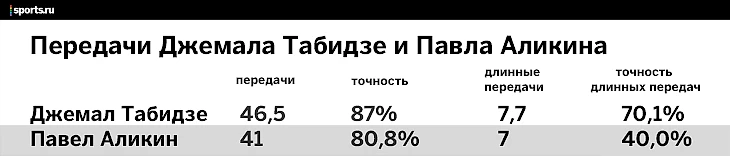 Замена Аликина на Табидзе, скорее всего, тоже связана с качеством длинных передач. Джемал – лучший центральный защитник РФПЛ по точности лонгболлов (70,1%).