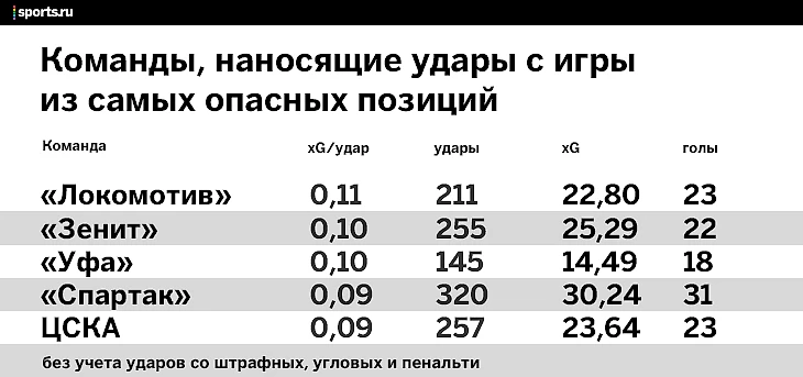 Нацеленность на кроссы, грамотное насыщение штрафной и подборы приносят «Уфе» неплохой результат. Команда Семака нанесла всего 194 удара за сезон (15-е место в лиге), но зато по количеству ударов из вратарской идет в пятерке.