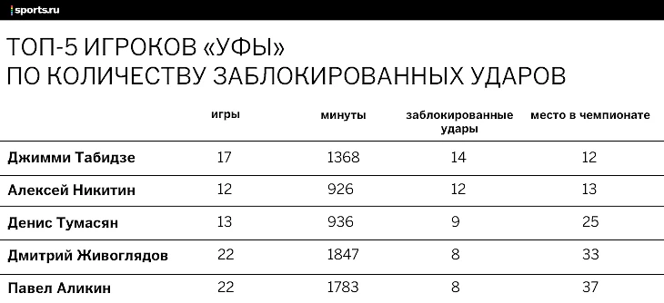 Интересно, что ни один игрок «Уфы» не входит в топ-10 по числу заблокированных ударов. Это связано и с тем, что блоки распределены между игроками, и с тем, что Семак иногда ротирует защитников.