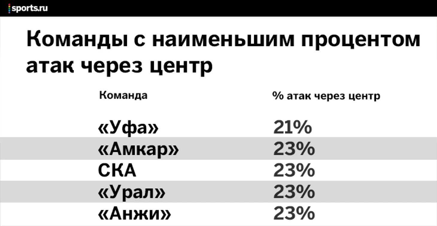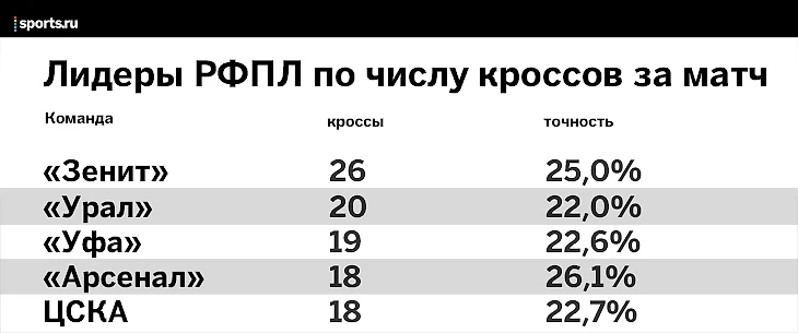 Фланговая активность сказывается сразу на нескольких статистических показателях. Первый – и самый очевидный – число кроссов. По ним «Уфа» входит в топ-3.