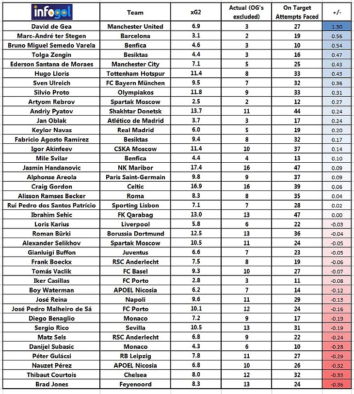 Лучший shot-stopper (прим: не всегда лучший вратарь в принципе) в ЛЧ на данный момент Давид де Хеа (вы же не удивлены?). Между ним и остальными расположилась статистическая пропасть.