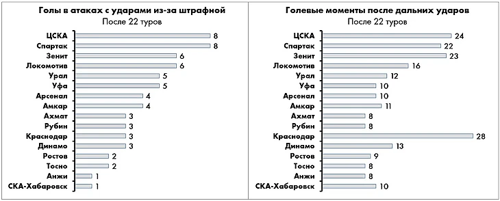 Как выясняется, только четыре команды чемпионата как минимум один раз в среднем за матч проводят атаку с прицельным ударом издали и реальной голевой перспективой. Наилучшей продуктивностью могут похвастаться ЦСКА и «Спартак» (по 8 голов), причем армейцы все свои голы забили с «игры», тогда как красно-белые трижды реализовали «ударные стандарты» (все три мяча на счету Фернандо). У «Зенита» голевая отдача пониже, но по отношению к прошлому сезону прогресс налицо – тогда за 30 туров после дальних ударов было забито лишь 4 гола.