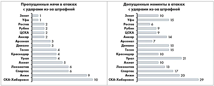 Лучше сопротивляемостью к дальнобойной артиллерии противника обладают «Зенит» и «Уфа», пропустившие после выстрелов из-за штрафной лишь по разу, хотя критических ситуаций такого рода у их ворот возникало достаточно. Во многом это связано с отличной игрой основных вратарей, которых отличает хороший выбор позиции и отменная прыгучесть (к слову, один из критериев голевой принадлежности - прыжок кипера с отрывом двух ног) .