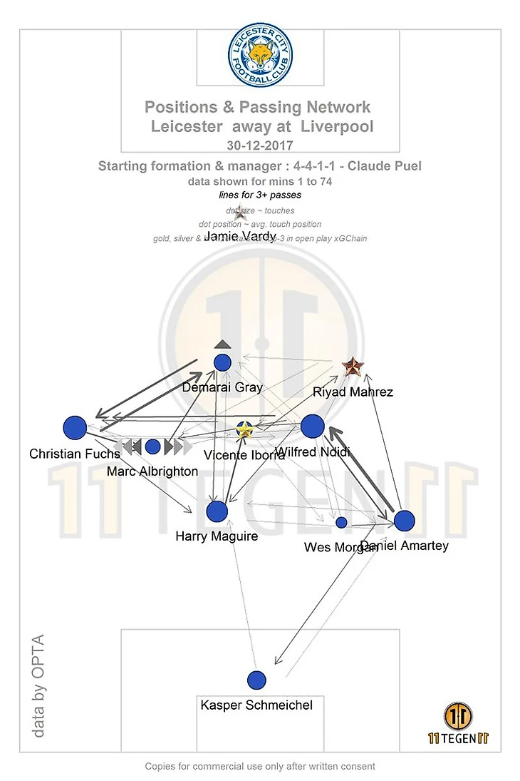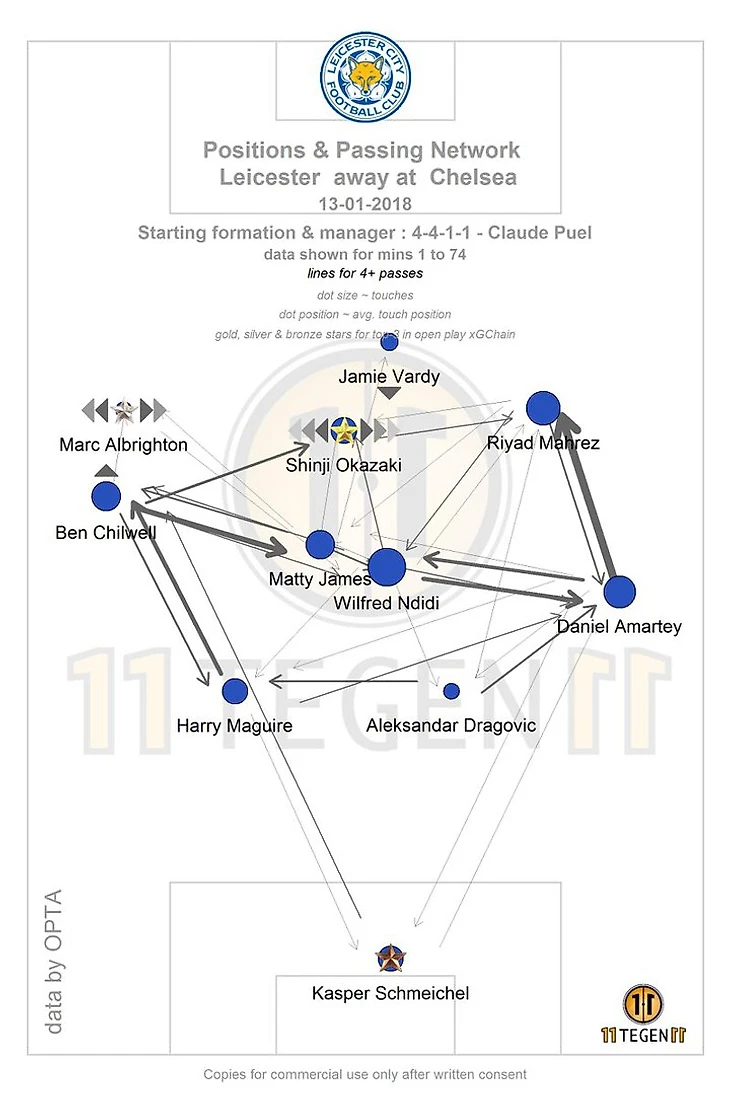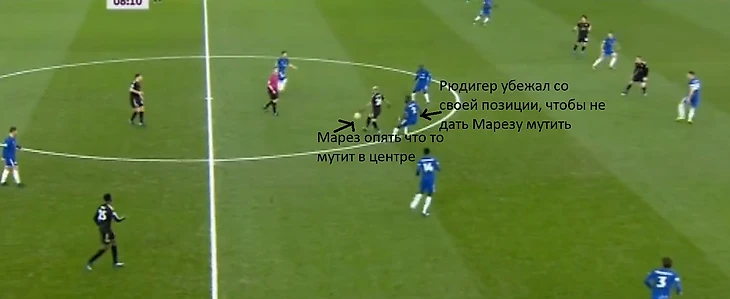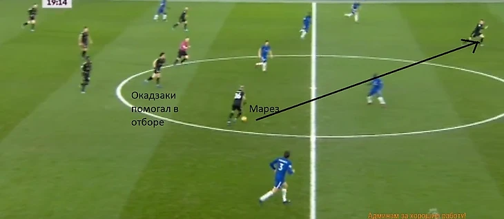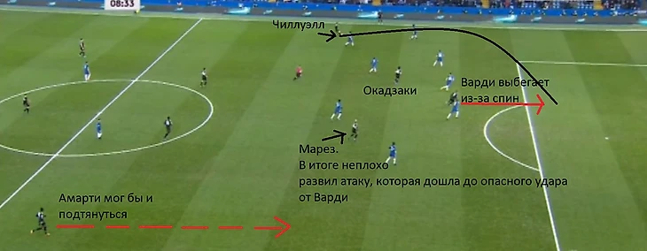 Примерно вот так выглядят эти смещения Мареза. Рияд разгоняет атаку, опускаясь глубоко за мячом, а затем уже сам оказывается на острие чуть ниже Варди, который постоянно пытается открыться за спину и убежать. Примеры из игры с «Челси».