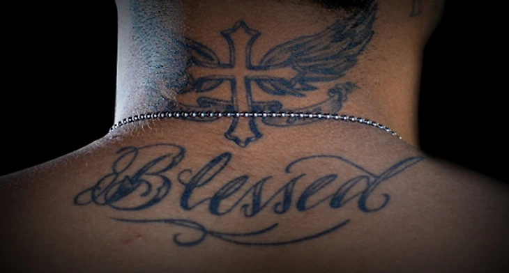 2. На спине у нападающего надпись, в переводе на русский означающая "Благословенный".