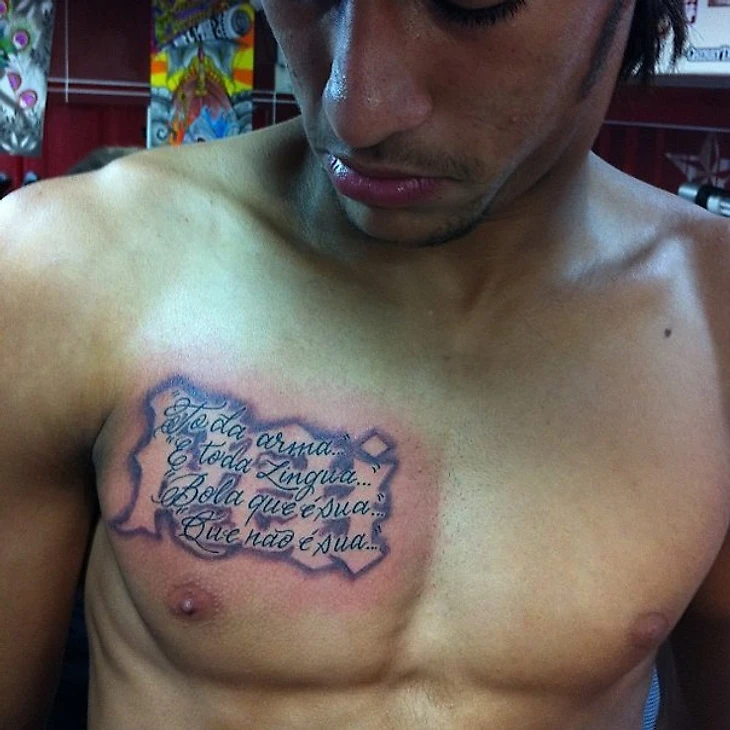3. На плече у Неймара расположен бриллиант с надписью, в переводе на русский означающая "сестра". Эта татуировка посвящена сестре Неймара, у которой наколот тот же бриллиант только с надписью "брат".