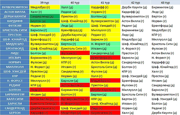 *Все цвета проставлены исключительно по моему мнению. Они никак не привязаны к бук. котировкам, поскольку для Чемпионшипа все довольно условно и быстро меняется.