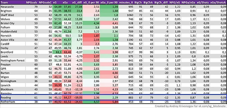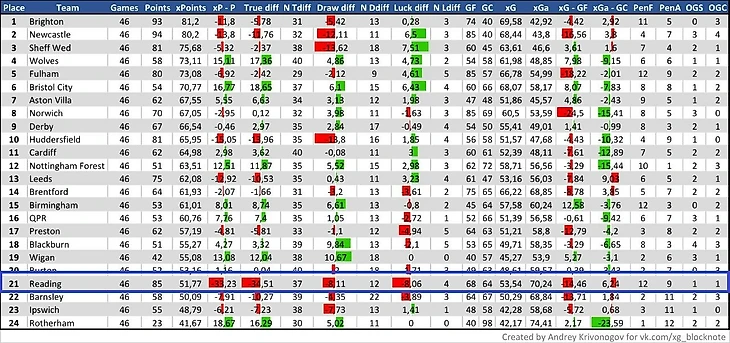 Да, Редингу просто-напросто невероятно везло в прошлом сезоне. И если "везение" Бёрнли отчасти является следствием их оборонительной модели, при которой между бьющим соперником и воротами располагается больше игроков (по сравнению с остальными командами лиги) и вследствие чего некоторые удары по их воротам переоцениваются (т.е. показатель xGa относительно игр Бёрнли не всегда корректен, что сказывается на дистанции и, соответственно, на xPoints, и в результате чего и формируется неприличный оверперфоманс. Подробнее с этой темой можно ознакомиться тут), то у Рединга нет ничего. Кроме удачи, разумеется.