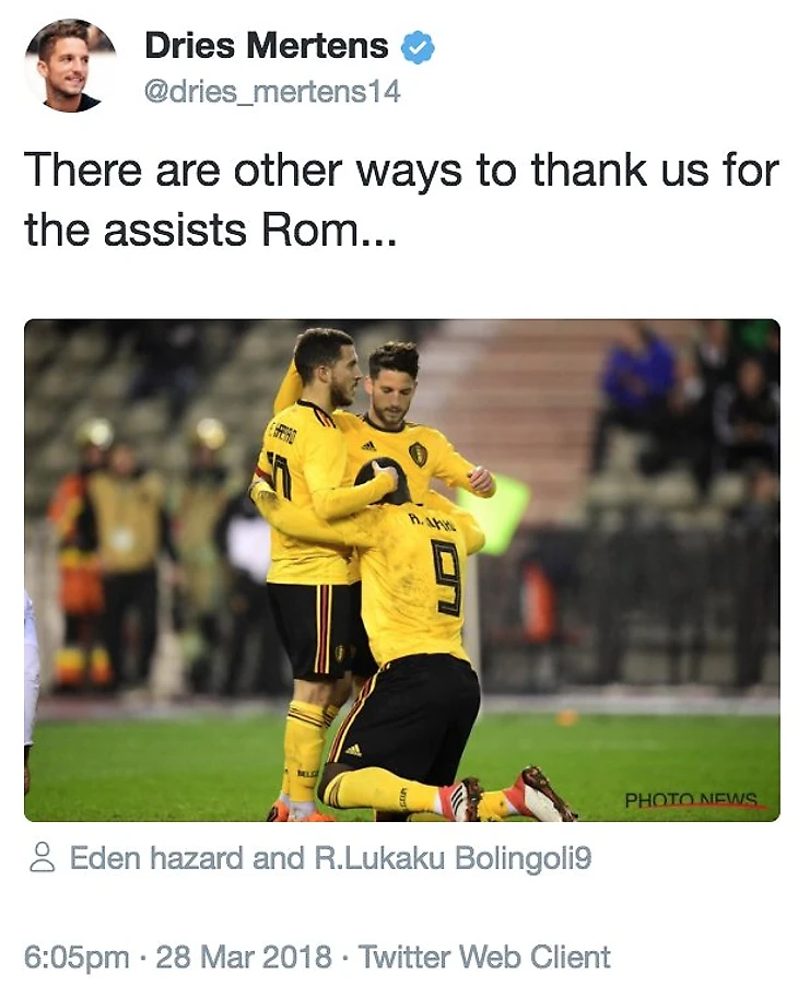 После второго гола Лукаку упал на колени перед Мертенсом и Азаром, отпраздновав так гол (Эден отдал передачу). Мертенс опубликовал фото этого момента в твиттере, подписав: