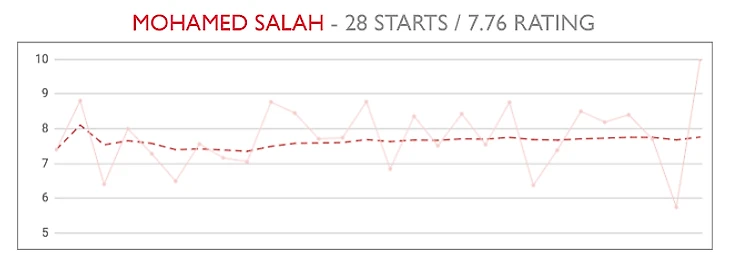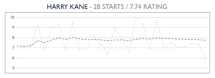 В графике Харри Кейна это наглядно продемонстрировано. Большинство оценок за матч либо значительно выше, либо ниже, чем его средний показатель в сезоне.