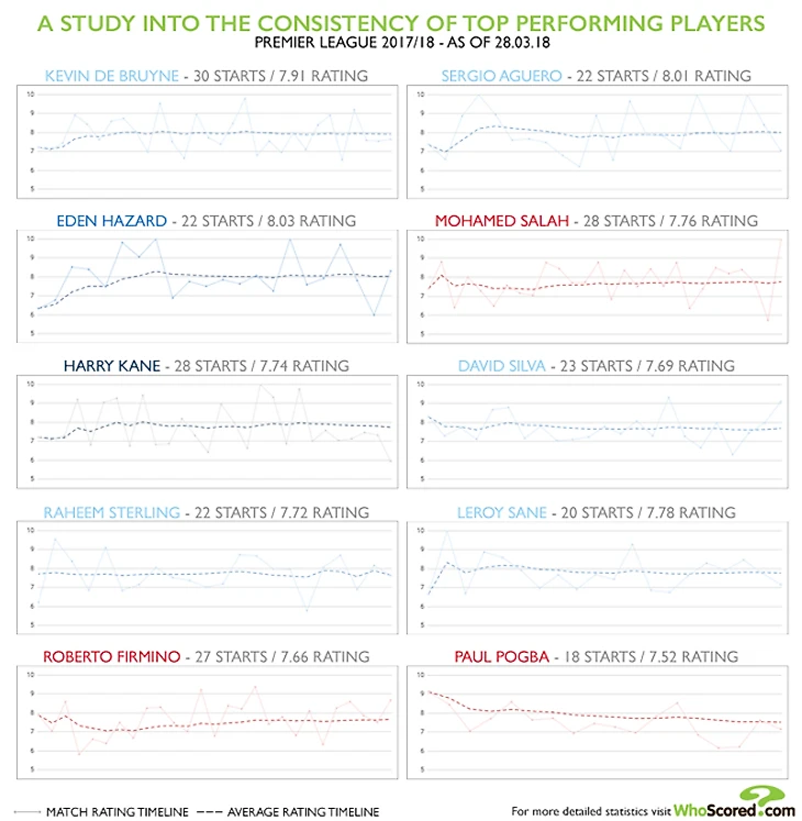 При составлении графиков лучших 10 игроков АПЛ (с точки зрения WhoScored), оценки за матчи, когда игроки выходили на замену, были исключены. В теории более стабильные игроки должны иметь меньше всплесков в своих оценках (оценка ниже, например) и более близкий график оценок за матч относительно их среднему показателю (пунктирная линия).