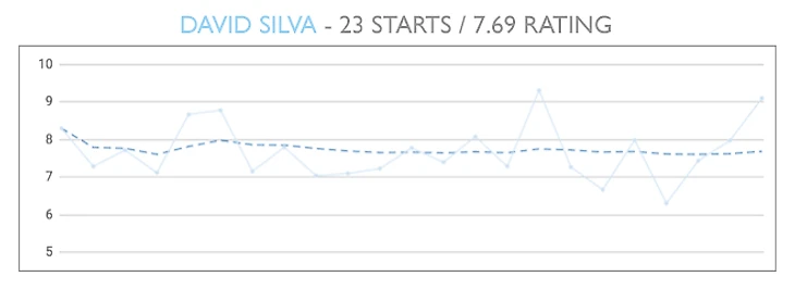 А самым стабильным на данный момент из этой 10-ки является Давид Сильва. Ему может быть 32 года, но эта кампания, безусловно, входит в число лучших из 8 его сезонов в «Манчестер Сити».