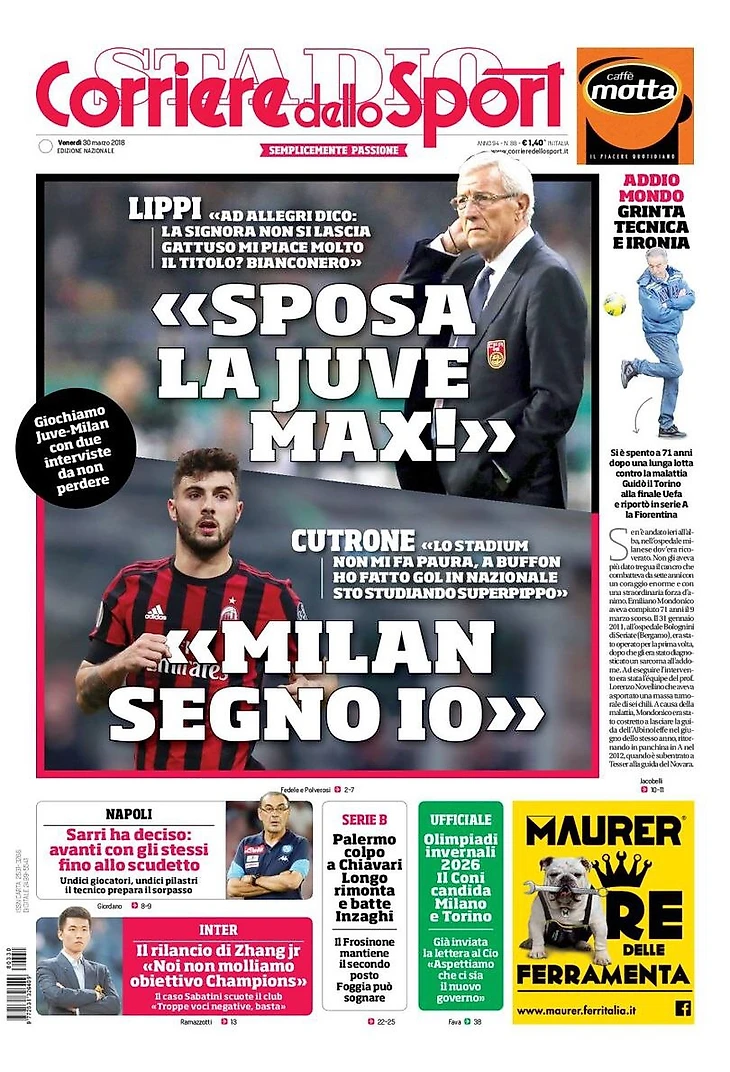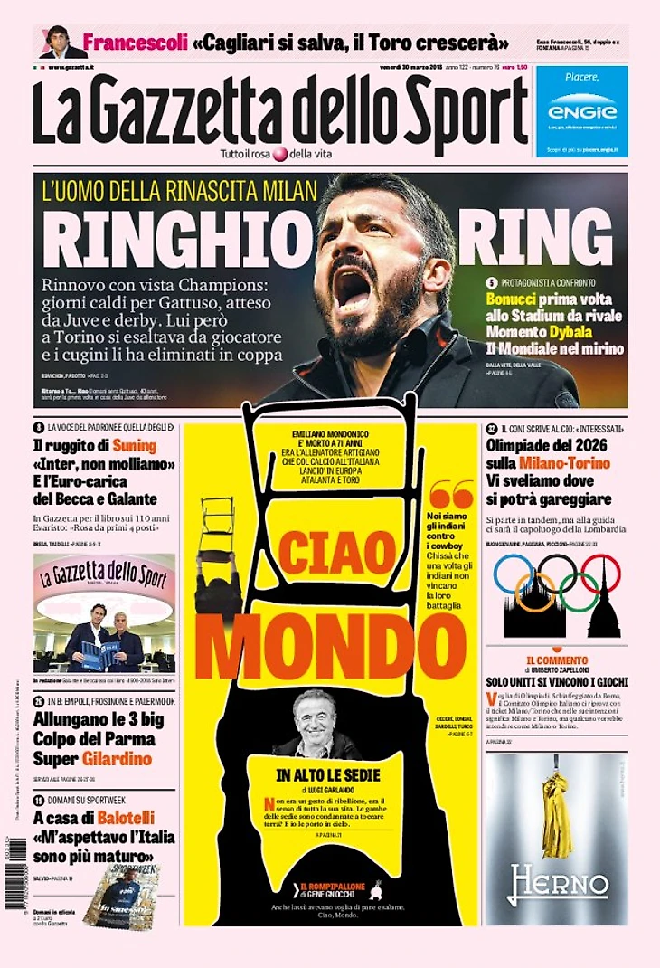 Ринг Рино. Заголовки Gazzetta, TuttoSport и Corriere за 30 марта