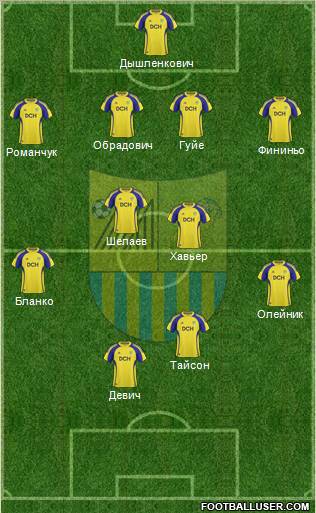 Нападающие «Металлиста» Девич и Тайсон (красные) прикрыты, и подвижный Тайсон (на переднем плане) вынужден отходить далеко назад в полузащиту для помощи в развитии атакующих действий.