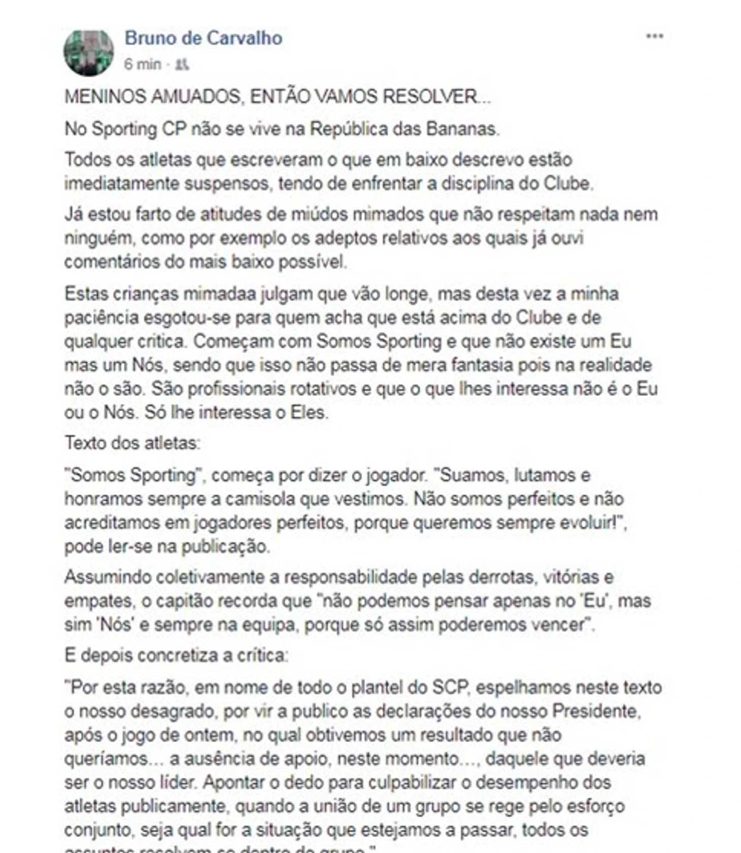 «Спортинг - это не какая-то банановая республика! Все футболисты, которые подписались под сообщением, с этого момента отстранены от первой команды. Я сыт по горло этими испорченными деть, которые никого не уважают и думают, что являются самыми важными в клубе. На этот раз моё терпение лопнуло!»