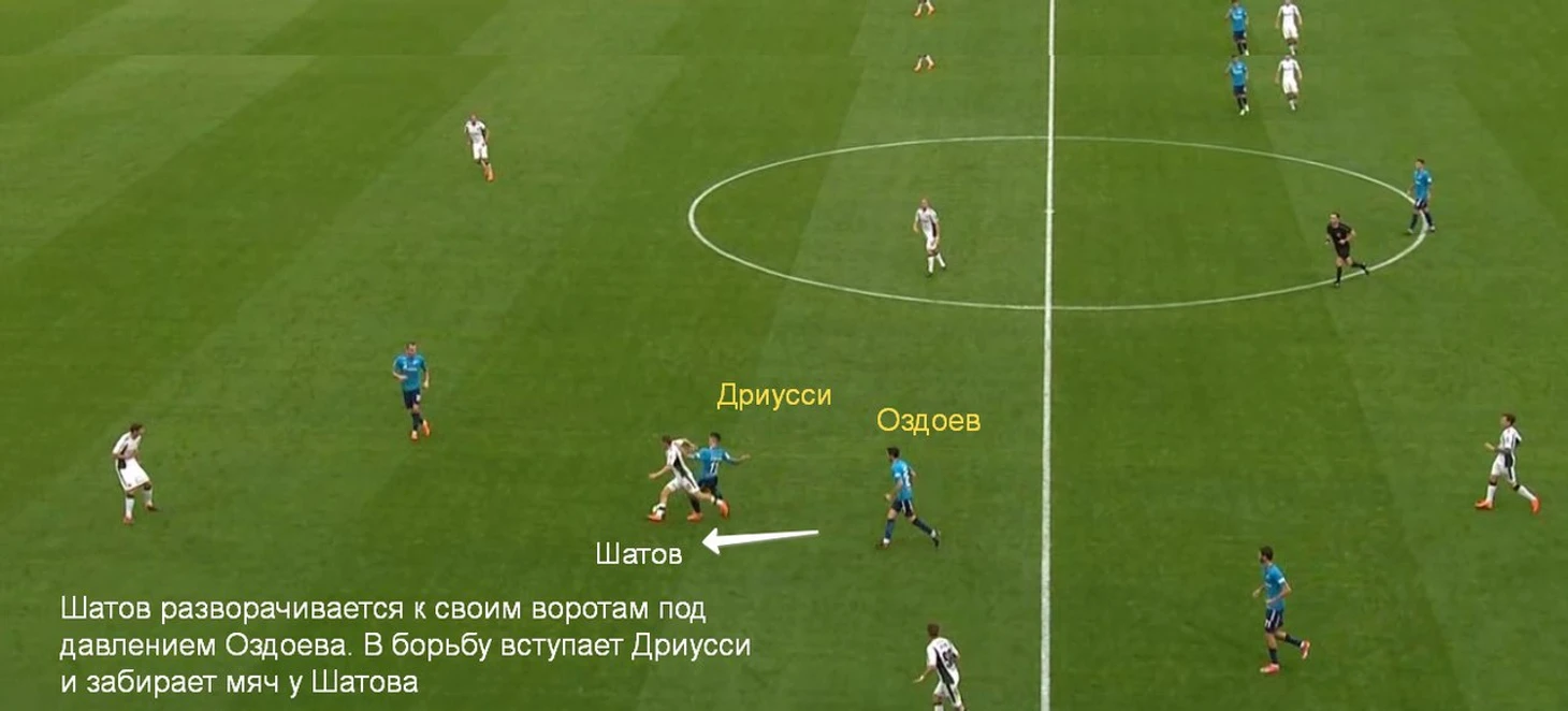 При обороне функции игроков «Краснодара» были четко распределены: Перейра действовал против Паредеса, Газинский – против Ерохина, а Шатов – против Оздоева. Мяч до Оздоева доходил (29 касаний), но сильного обострения от Магомеда не следовало: 0 ударов, 0 передач под удар с игры (1 – с углового), всего 8 передач в финальную треть (меньше у «Зенита» сделали только Ригони, Жирков и Иванович).