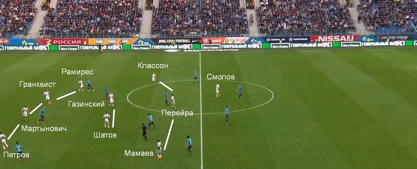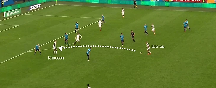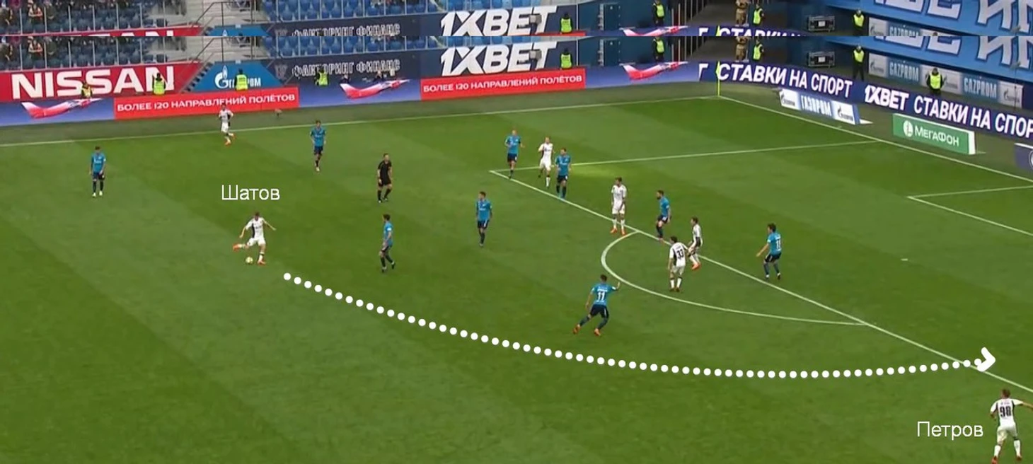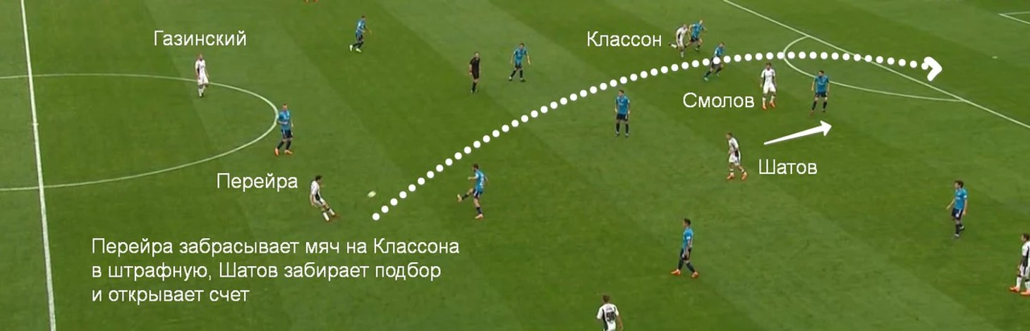 Во время позиционных атак «Краснодара» Шатов, как и при Шалимове, либо поднимался на одну линию с Перейрой, либо занимал место уругвайца под Смоловым. Шатов и забил как раз после того, как Перейра опустился в глубину и забросил на Классона в штрафную «Зенита».