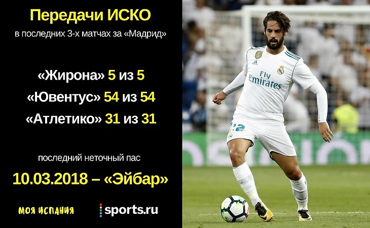 Раздел текста совсем небольшой по количеству слов, но значимый. Против «Ювентуса» Иско сделал 54 точных паса из 54, против «Атлетико» из 31 все оказались опять точными. До этого с «Жироной» он сделал 5 точных передач из 5. В последний раз он ошибался в матче против «Эйбара» месяц назад.