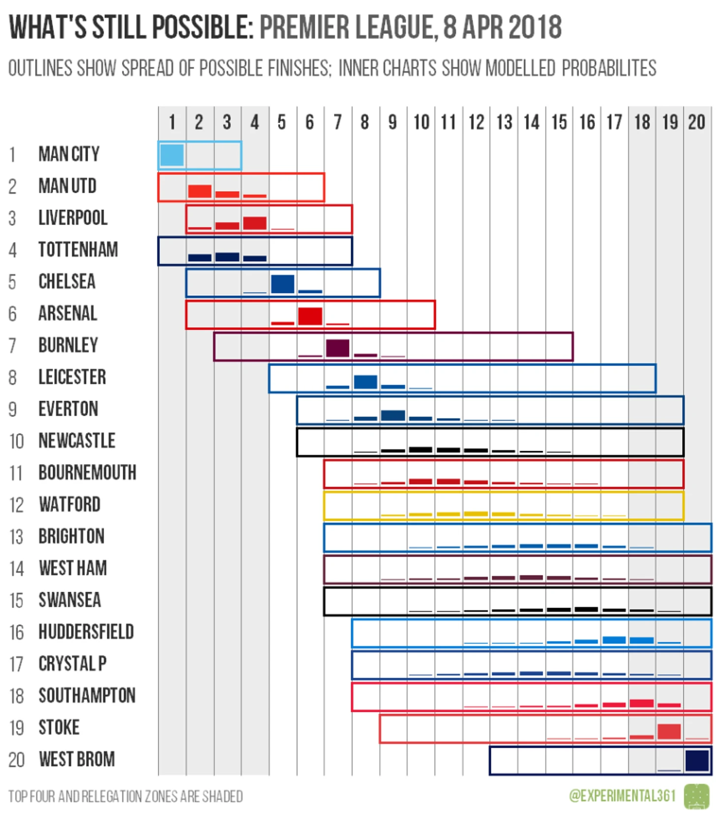 Чисто математически всё ещё возможно, что и «Манчестер Юнайтед», и Тоттенхэм выиграют АПЛ. «Ливерпулю» в этом сезоне это уже не удастся (как и «МЮ» с «ТТХ», если угомонить фантазию) «Челси», «Арсенал» и «Бернли» всё ещё могут рассчитывать на чудо (попадание в ЛЧ). «Лестер» и все, кто ниже «лис» в таблице, ещё не обезопасили себя от вылета. Ну а «ВестБром» всё ещё может спастись (хоть я в этом и сильно сомневаюсь).