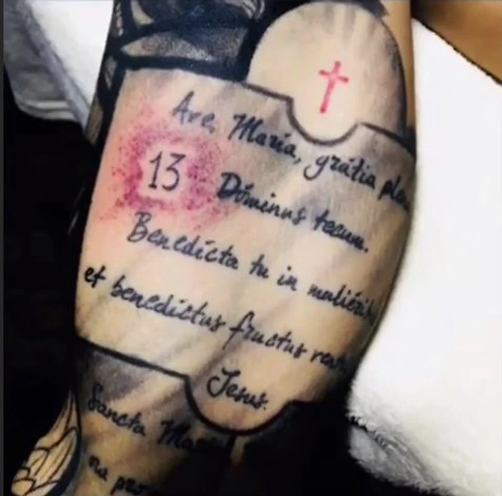 Последний сильный пример – татуировка, которую Федерико посвятил своему бывшему партнеру и другу Давиде Астори. Он набил на руке текст молитвы «Аве, Мария» и номер 13, под которым играл капитан «Фиорентины».